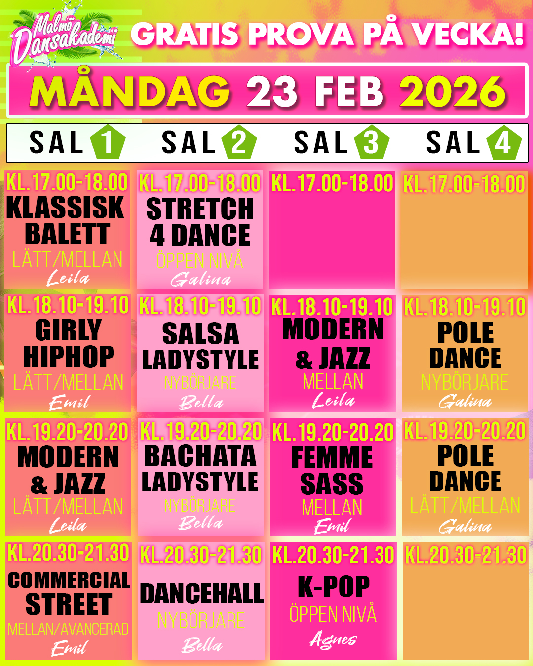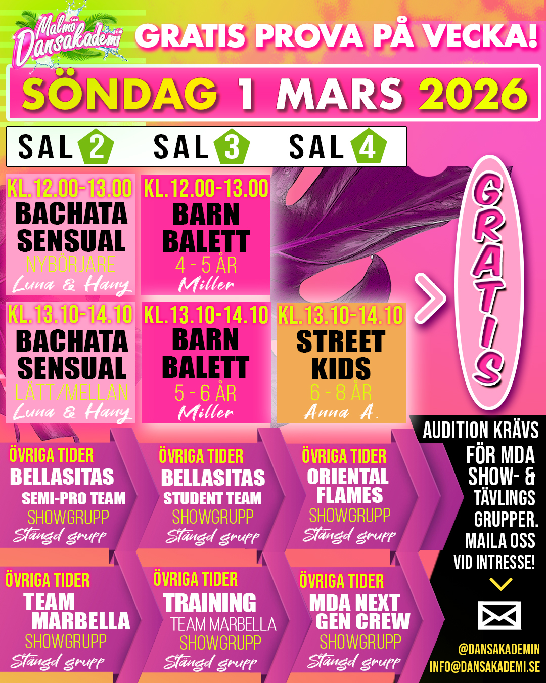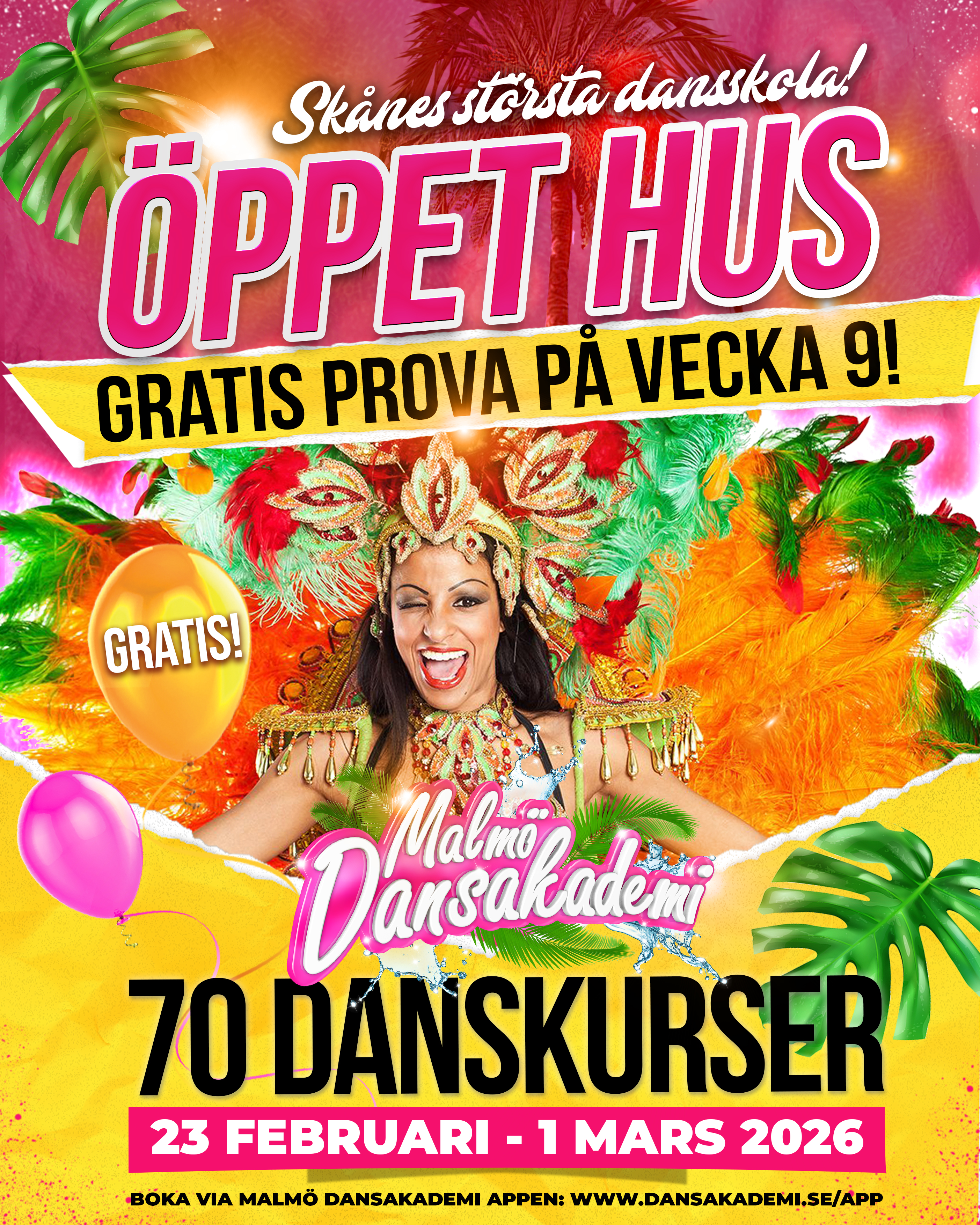 Skånes största dansskola: Malmö Dansakademi slår upp sina dörrar för vårtermin 2026! Under första veckan av terminen har vi en gratis öppet hus vecka för alla nya och gamla elever. Då är allmänheten välkomna att prova på alla våra kurser som ej är fullsatta, GRATIS, hela första veckan!