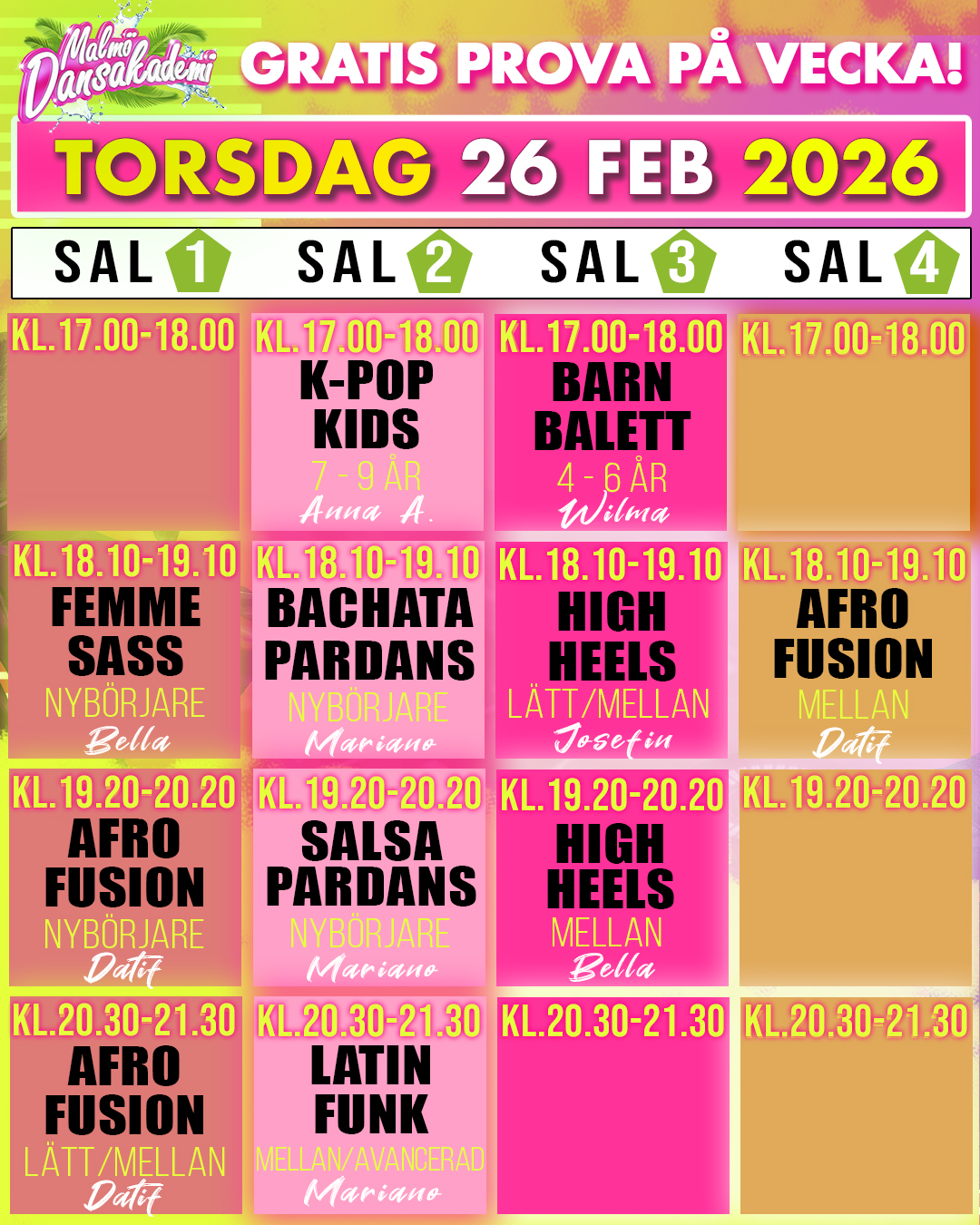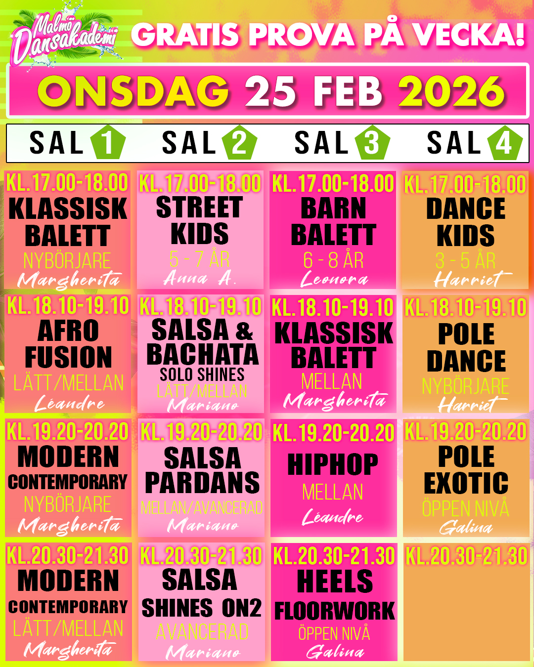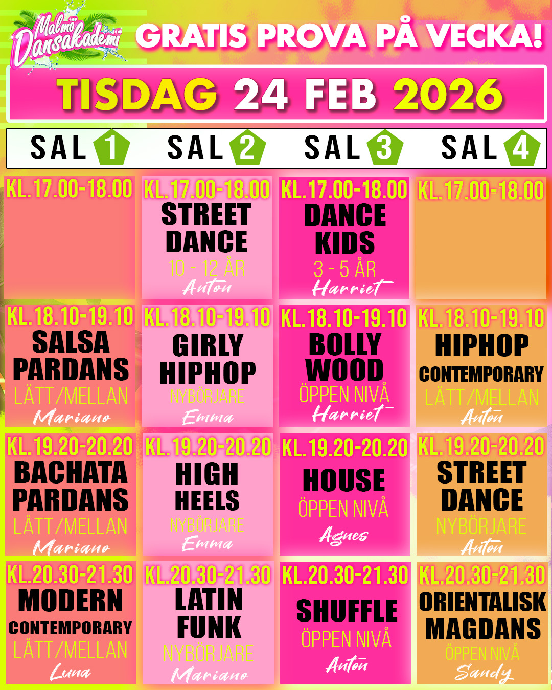 Skånes största dansskola: Malmö Dansakademi slår upp sina dörrar för vårtermin 2026! Under första veckan av terminen har vi en gratis öppet hus vecka för alla nya och gamla elever. Då är allmänheten välkomna att prova på alla våra kurser som ej är fullsatta, GRATIS, hela första veckan!